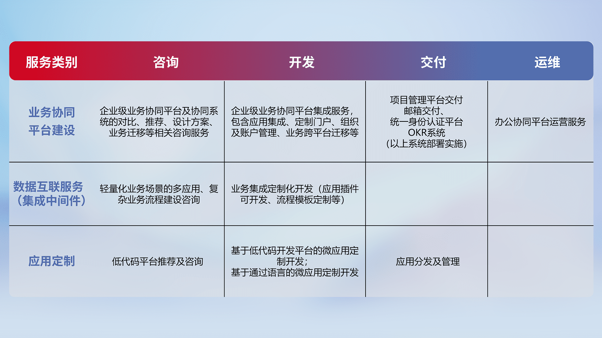 针对钉钉、、、、企微、、、IDaas等平台级产品提供产品的规划、、、方案、、、、交付、、、、定制化开发等服务,,,,实现如统一协同办公、、智能客户服务、、混合会议管理、、、智能数据查询、、等业务场景,,,,实现数字化转型。。。