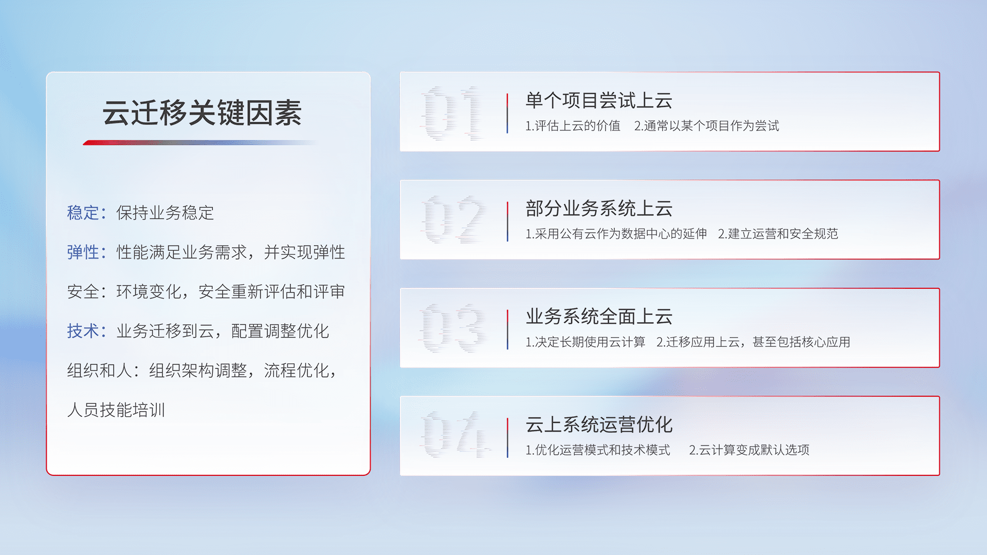 结合实际业务,,从规划设计、、、、云平台选型、、、云原生改造、、、数据迁移、、集成交付,,迁移全过程为客户识别最佳上云路径,,做好风险识别管理,,设计网络架构、、身份权限、、安全审计合规、、、操作审计、、日志审计、、、、监控告警策略、、、多站点容灾设计等,,对云上基础设施进行整体规划,,,,提升IT治理水平,,,以满足弹性、、高可用、、、、高性能的需求。。。