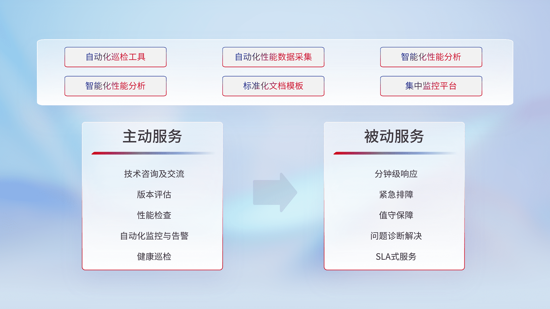 智能化工具和标准化文档,,,,保障服务质量,,,,提供主动服务(包含技术咨询、、版本评估、、、、性能检查、、、、自动化监控与告警、、健康巡检)和被动服务包含(分钟级响应、、紧急排障、、值守保障、、、问题诊断解决、、、SLA服务)。。。